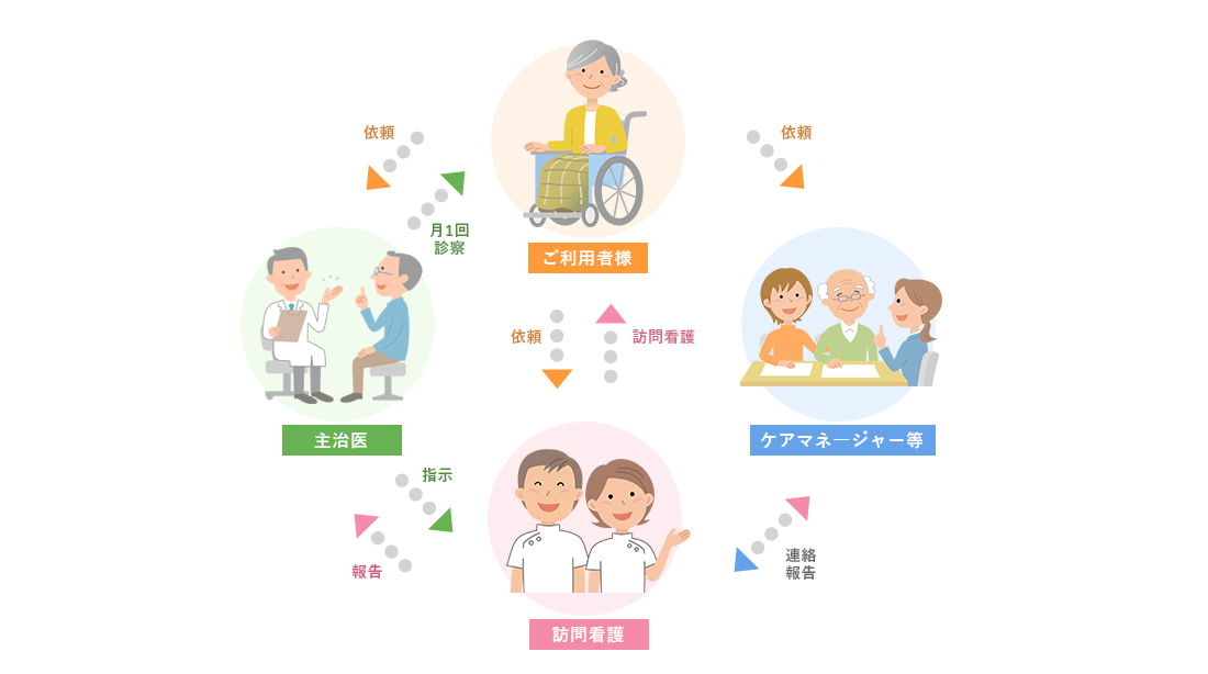 当院をかかりつけ医とする方々を対象に、かかりつけ医の指示に基づき、看護師がご自宅まで訪問し、看護ケアを行います。